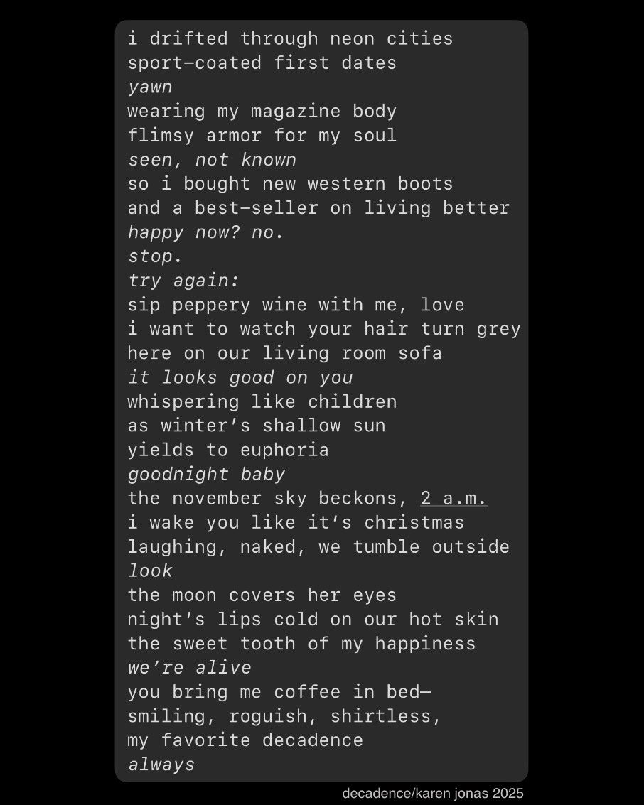 poem/decadence Karen JonasNov 20, 202534Sharethis started yesterday morning as a poem about sovereignty-about not wanting. somewhere around 5 am it took a soft turn: it wanted to be about having. xo
